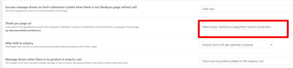 Enquiry plugin has a setting that allows you to redirect to a specific page after the submission of the enquiry form. So we will use this option to track conversion.