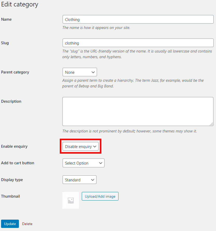 By default enquiry is enable for all the categories in the site, to disable it for some category go to the category edit page of that cateogry