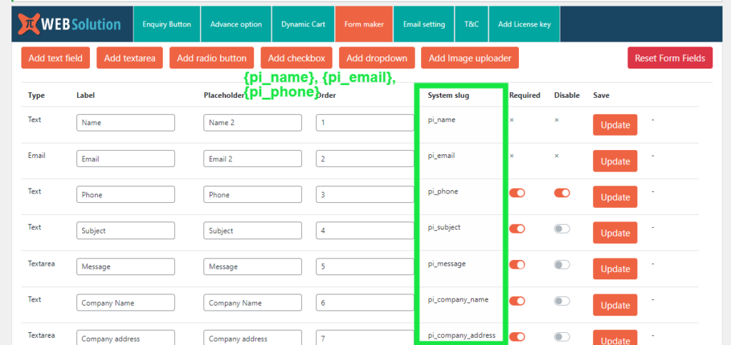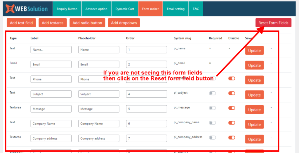 If you are not seeing any form field in your enquiry form and also not seeing any form field in the Form maker, then click on the Reset Form Field button on the Form maker page that will fix the issue