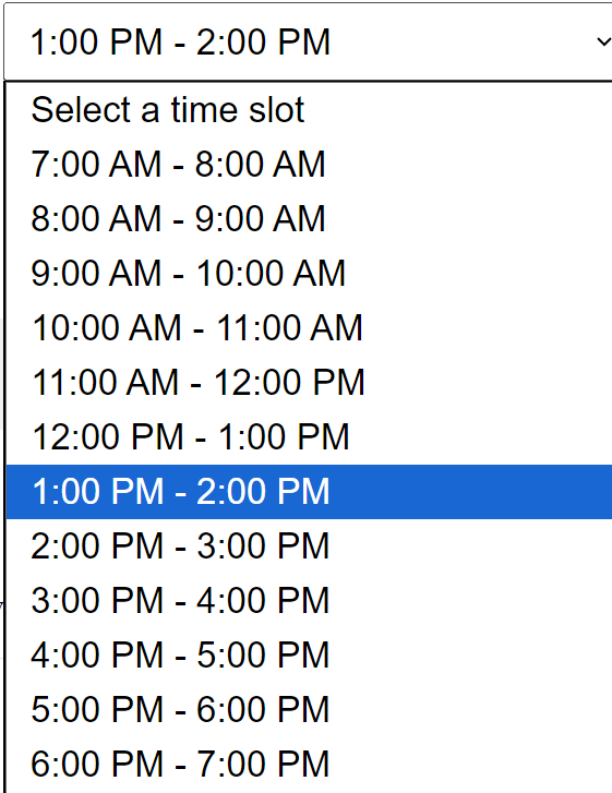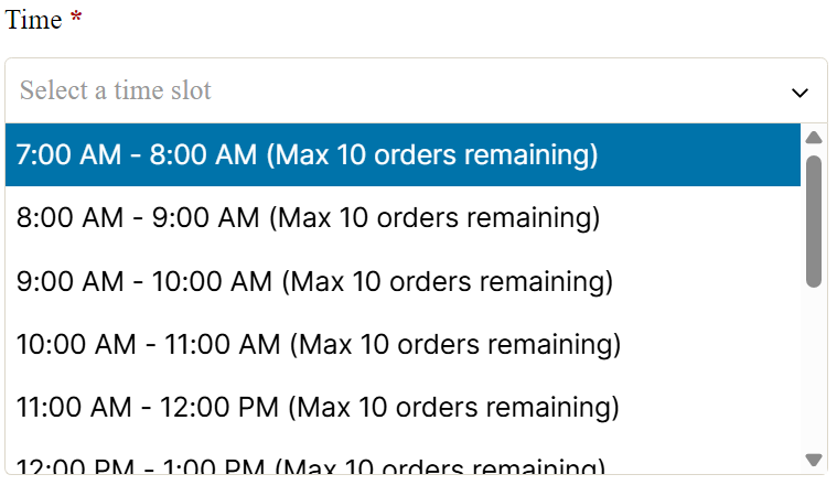 • Time Slot – Customers choose from predefined time ranges like 2 PM – 3 PM, 3 PM – 4 PM.
