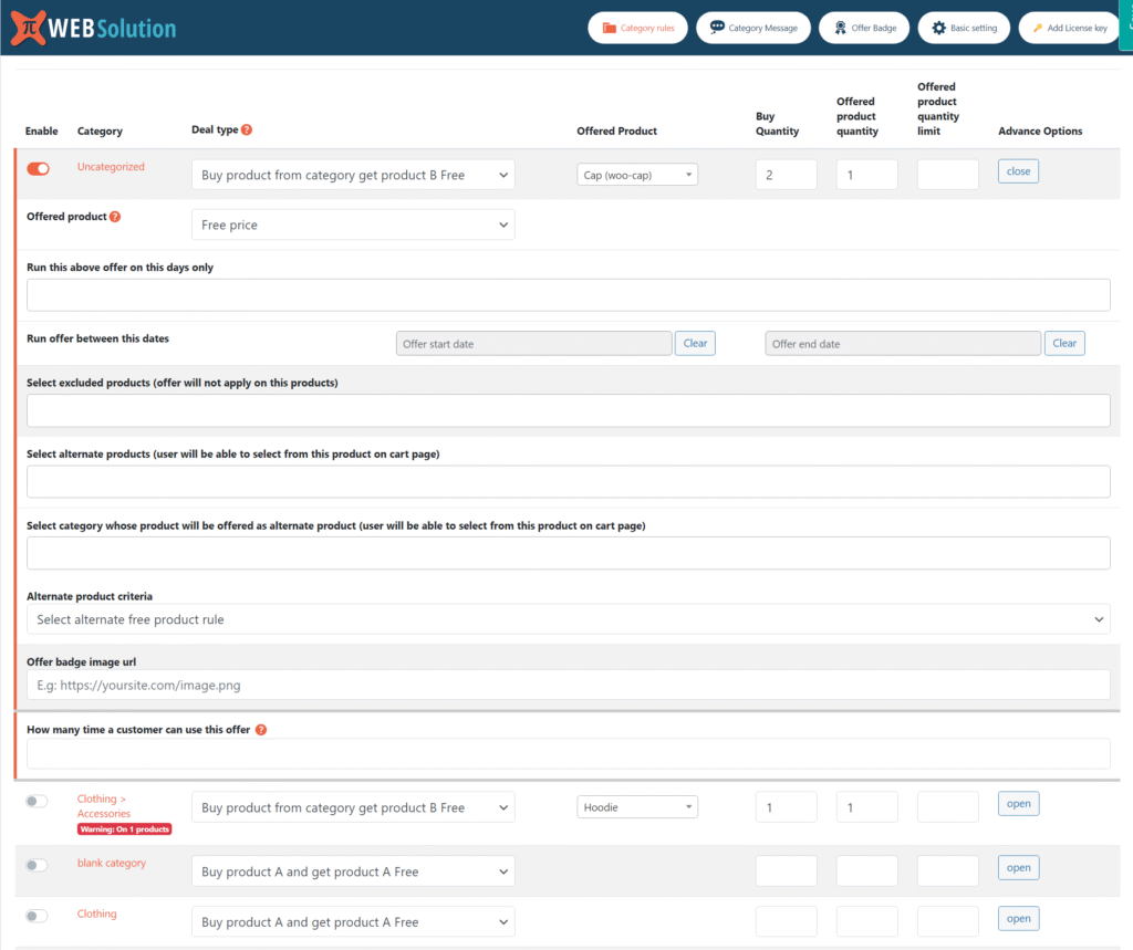 - Offer this category product as alternate → Let customers choose a free product from a specific category.