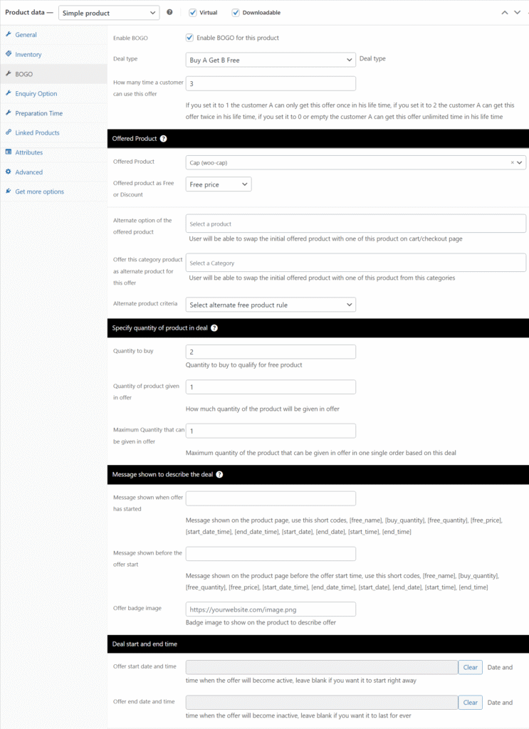 - Example: If your variable product is a T-Shirt with sizes S, M, L, then all sizes will have the same BOGO deal.